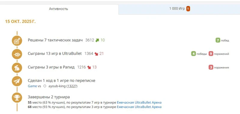 В первый же день, я решила "задачу дня" и мне сразу прибавили 500 пунктов рейтинга. Потом следующая задача (на мат в 2 хода) и ещё 200 пунктов. Потом, я играла с компьютером 5 уровня (если честно, он меня обыграл) и с другими игроками.