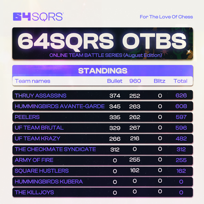 On 23 August the series switched to the unpredictable Freestyle (Chess960) format, where random starting positions reward creativity and instinct. Seven teams battled for two hours. UF Team Brutal seized the moment, scoring 267 points to edge Hummingbird’s Avante‐Garde (263) and Peelers (262). The Army of Fire surprised many with 255, while Thruy Assassins slipped to fifth on 252 after a slow start. UF Team Krazy (216) and Square Hustler’s (162) completed the order.