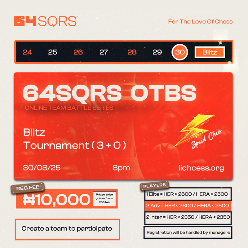 Join us on Lichess and follow @64SQRS for live commentary and chat. For the love of chess, may the best team win!
