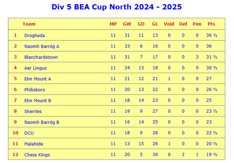 The finale of our quest for promotionIn two previous posts (Part 1 and Part 2), I recounted how my local chess club here in Dublin, Ireland, has battled to win promotion in our local league. Currently, my club, Naomh Barróg, is in division 5, the BEA Cup North and has been trying for several years to win promotion. The winners of the league automatically get promoted while the runners-up go to a playoff.